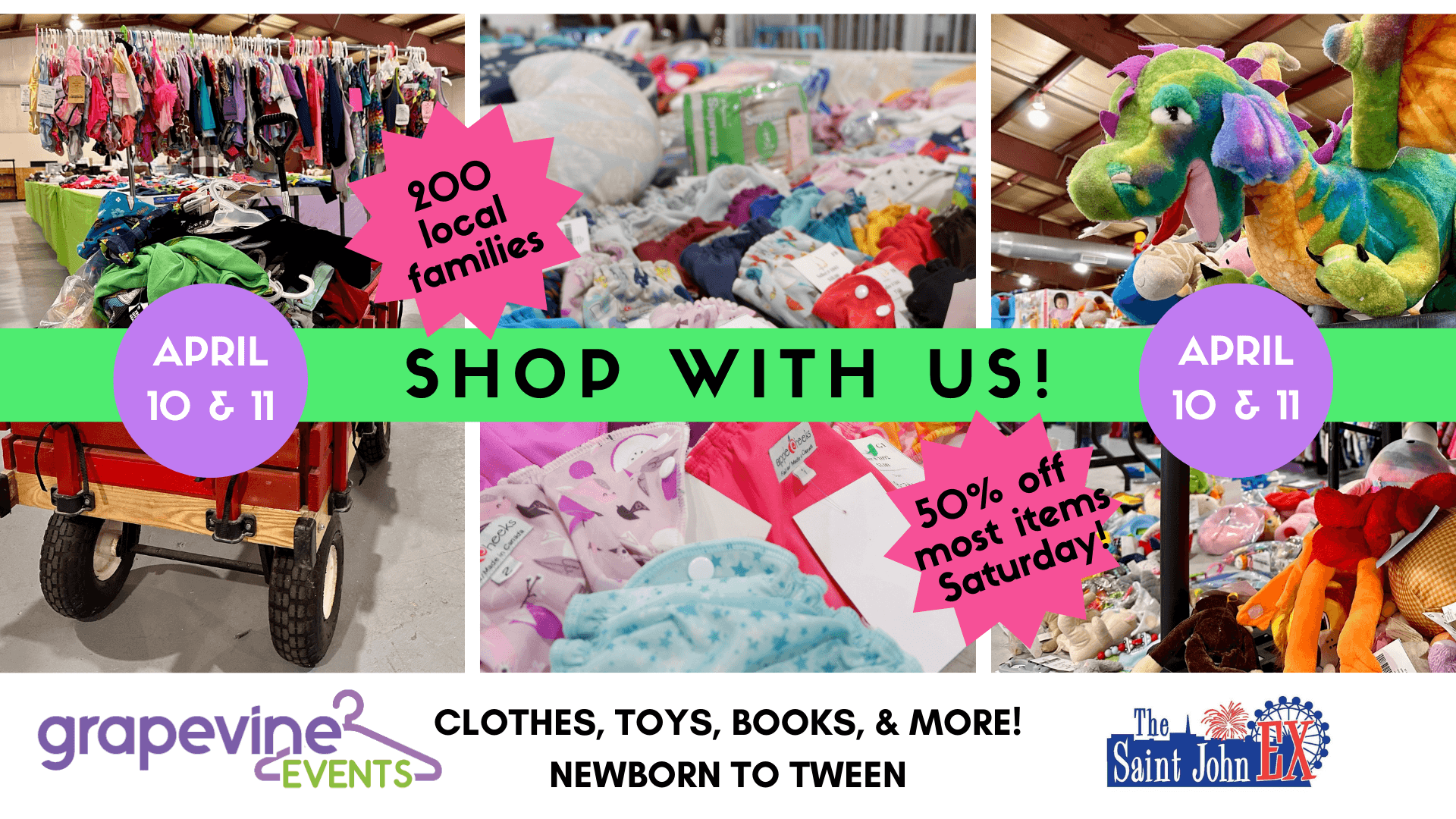 Grapevine Events’ twice-a-year pop-up is back – and bigger than ever! 200 local families, thousands of items (all hanging!), discount shopping on Saturday, & more! Free entry Friday night 5-8pm & Saturday 10am-2pm.
